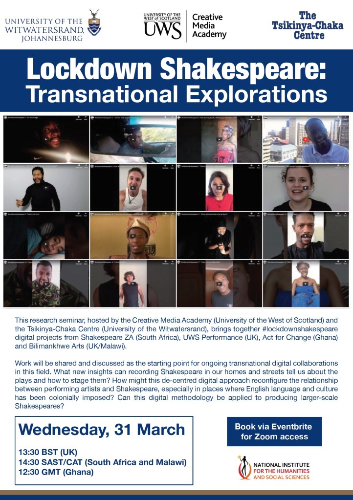 This led to the Lockdown Shakespeare: Transnational Explorations, co-hosted by University of the Witswatersrand, Tsikinya-Chaka Centre and University of the West of Scotland where an international mix of scholars and theatre artists shared innovative, site-based Shakespeare digital practice.